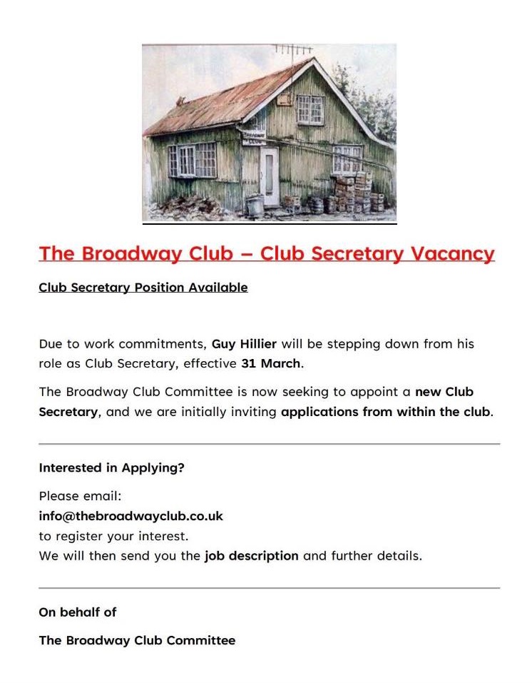 As usual if you have any AOB which you would like discussed at the AGM, please send details to info@thebroadwayclub.co.uk at least two weeks before the meeting. As with previous meetings, we will not accept any new AOB for discussion on the day, so if you have something to raise, please make sure you send it before the deadline of March 28th.